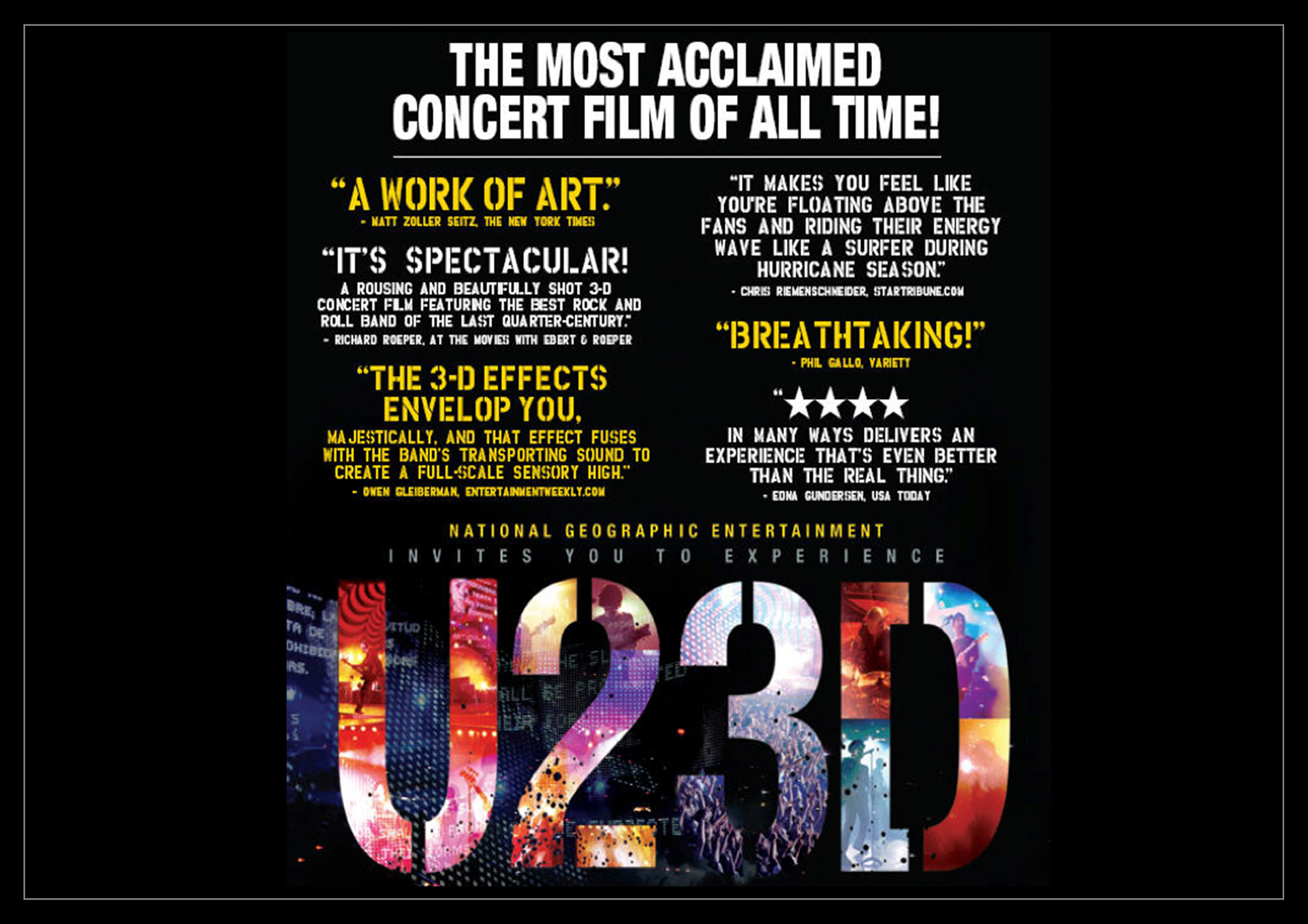 Titles, logomark, trailer and posters for U23D concert film. Directed by Catherine Owens and Mark Pellington. Film open. Design, editorial animation and sound design. Done at Spontaneous.